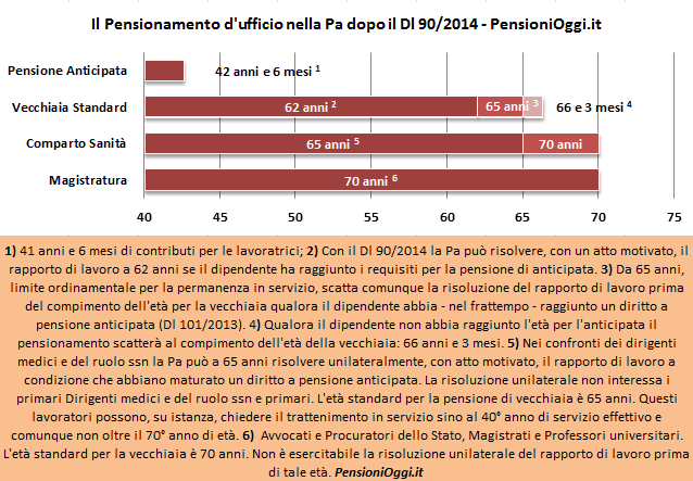 Il grafico sottostante mostra gli effetti del Dl 90/2014 sui lavoratori del comparto pubblico che hanno raggiunto un diritto a pensione anticipata prima dell'età della vecchiaia. Le parti in rosso scuro indicano l'età minima per l'esercizio della risoluzione unilaterale del rapporto di lavoro, ove ammissibile.