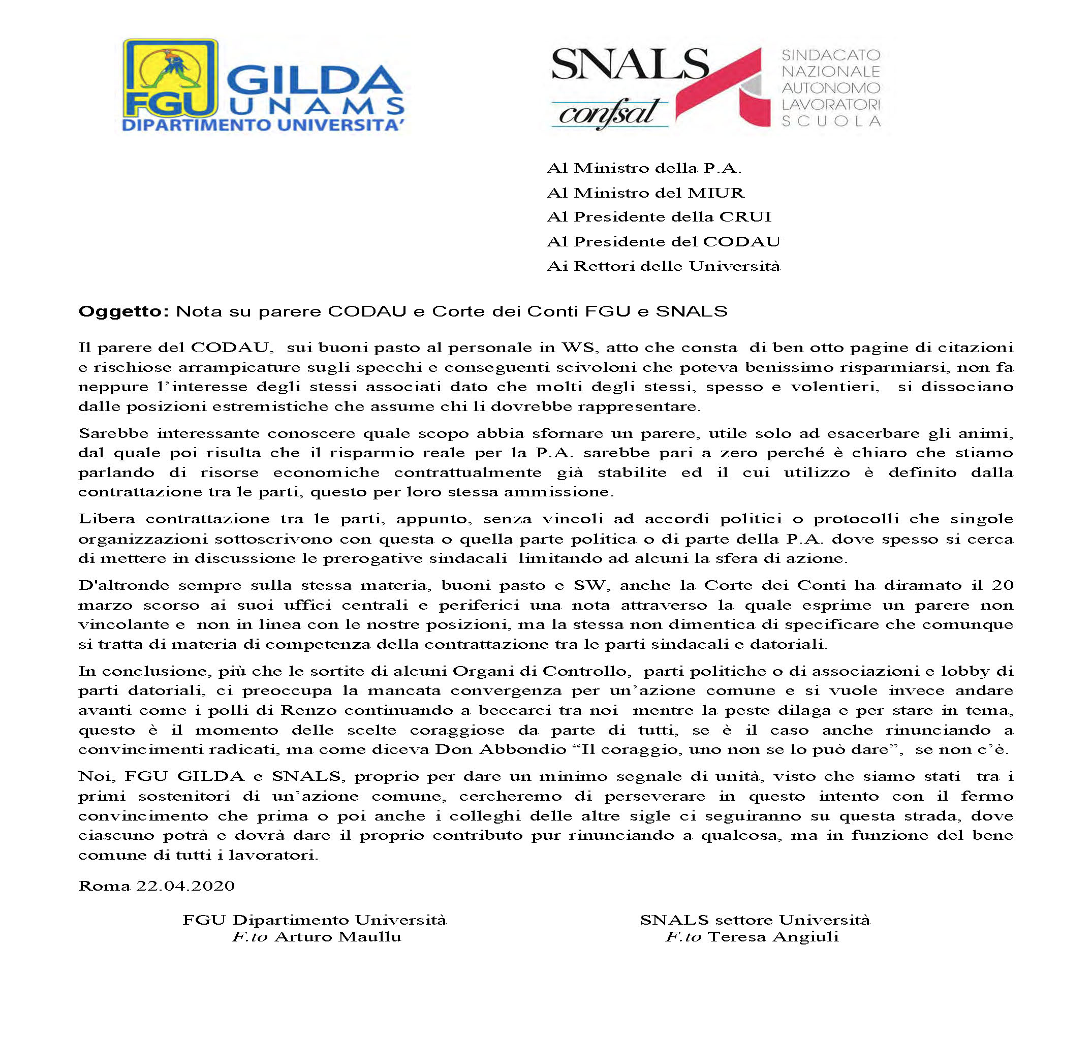 Nota FGU e SNALS del 22.04.2020 su parere CODAU e Corte dei Conti - SW e Buoni pasto