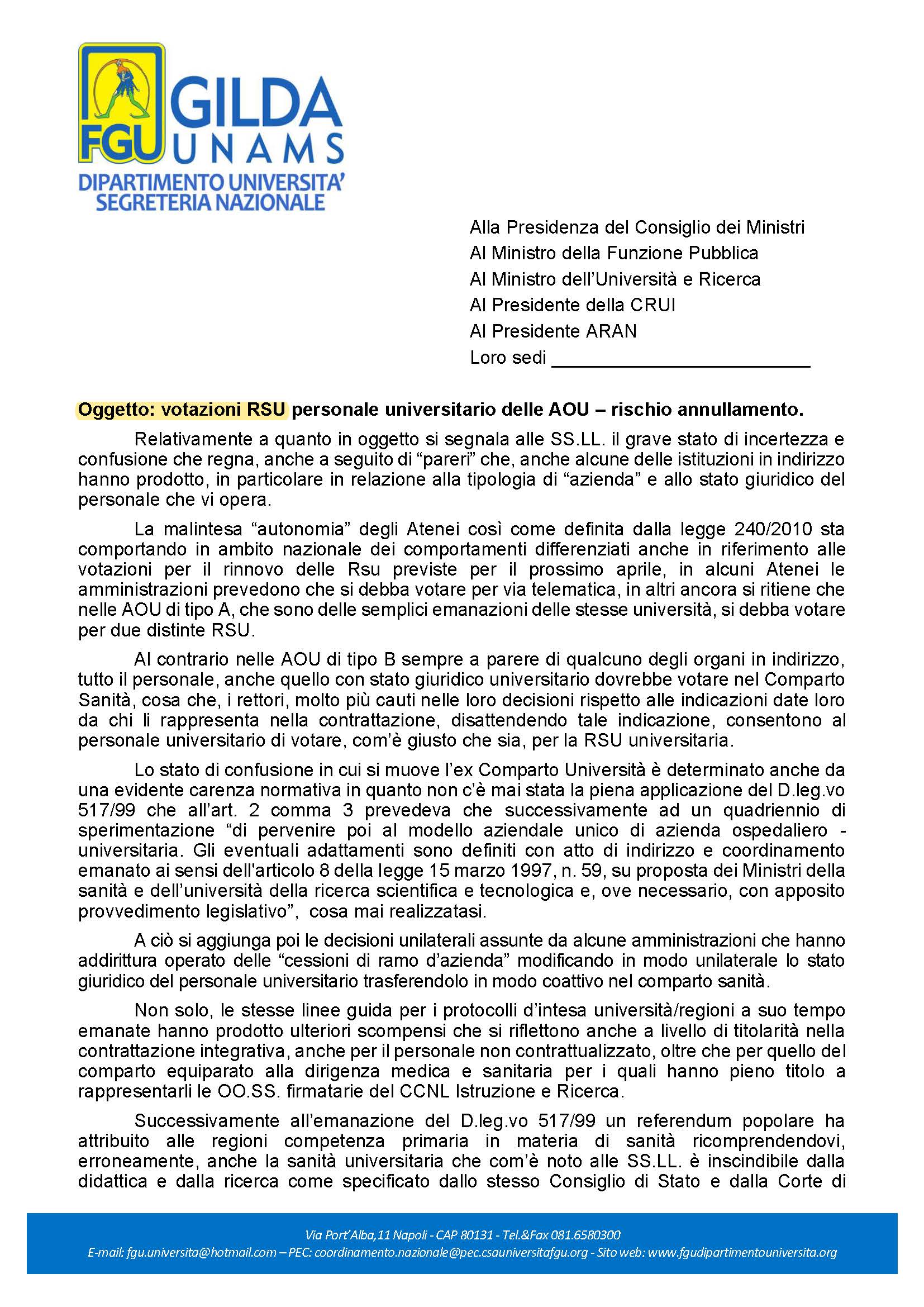 Si informa che la scrivente Organizzazione Sindacale ha inviato in pari data una nota alla Presidenza del Consiglio dei Ministri, al Ministro della Funzione Pubblica, al Ministro dell'Università e Ricerca , ai Presidenti della C.R.U.I.(Conferenza dei Rettori delle Università italiane), e dell'Aran (Agenzia per la Rappresentanza Negoziale delle Pubbliche Amministrazioni), alla luce dello stato di incertezza e di confusione venutosi a creare a seguito di ''pareri'' contrastanti in relazione alla tipologia di "Azienda" ed allo stato giuridico di chi vi opera,