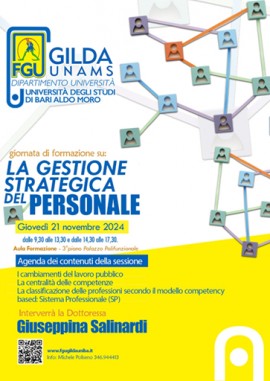 Il giorno 21 novembre 2024, dalle ore 09:30 alle ore 13:30 e a dalle 14,30 alle 17,30 presso: l’Aula Formazione 3 piano – Palazzo Polifunzionale dell'Università di Bari, si terrà un un'assemblea formativa in cu verranno trattati anche i contenuti previsti dal nostro CCNL 2019/2021, art. 81, comma 6, lettere J) e K). j) i criteri generali per la graduazione degli incarichi di posizione organizzativa e professionale, ai fini dell’attribuzione della relativa indennità; k) i criteri per il conferimento e la revoca degli incarichi di posizione organizzativa e professionale.Gli iscritti potranno collegarsi al seguente link: La Gestione Strategica del Personale Per ricevere un attestato di partecipazione e le slide del corso al termine del seminario, contattare via e-mail Michele Poliseno a: michele.poliseno@uniba.it