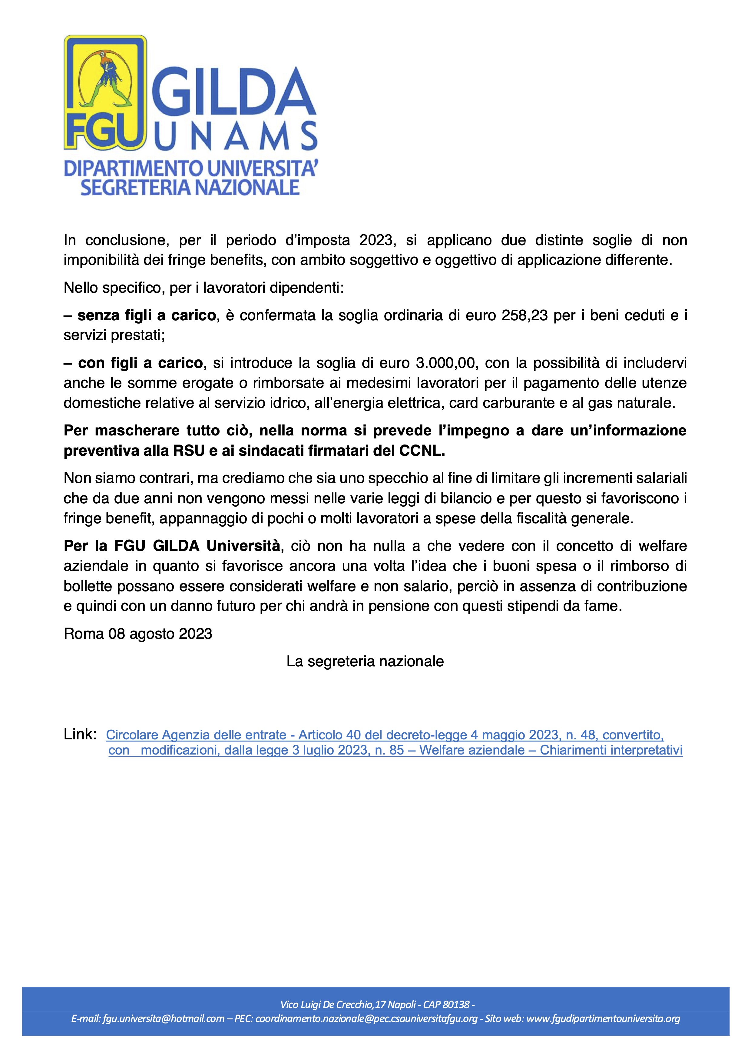 Infine, la FGU ha evidenziato la necessità di istituire un nuovo Fondo accessorio per la figura del Tecnologo, al fine di non fare aggravare la spesa sul Fondo degli EP, in quanto tutt’oggi sussiste l’annosa problematica del superamento del tetto del Fondo;