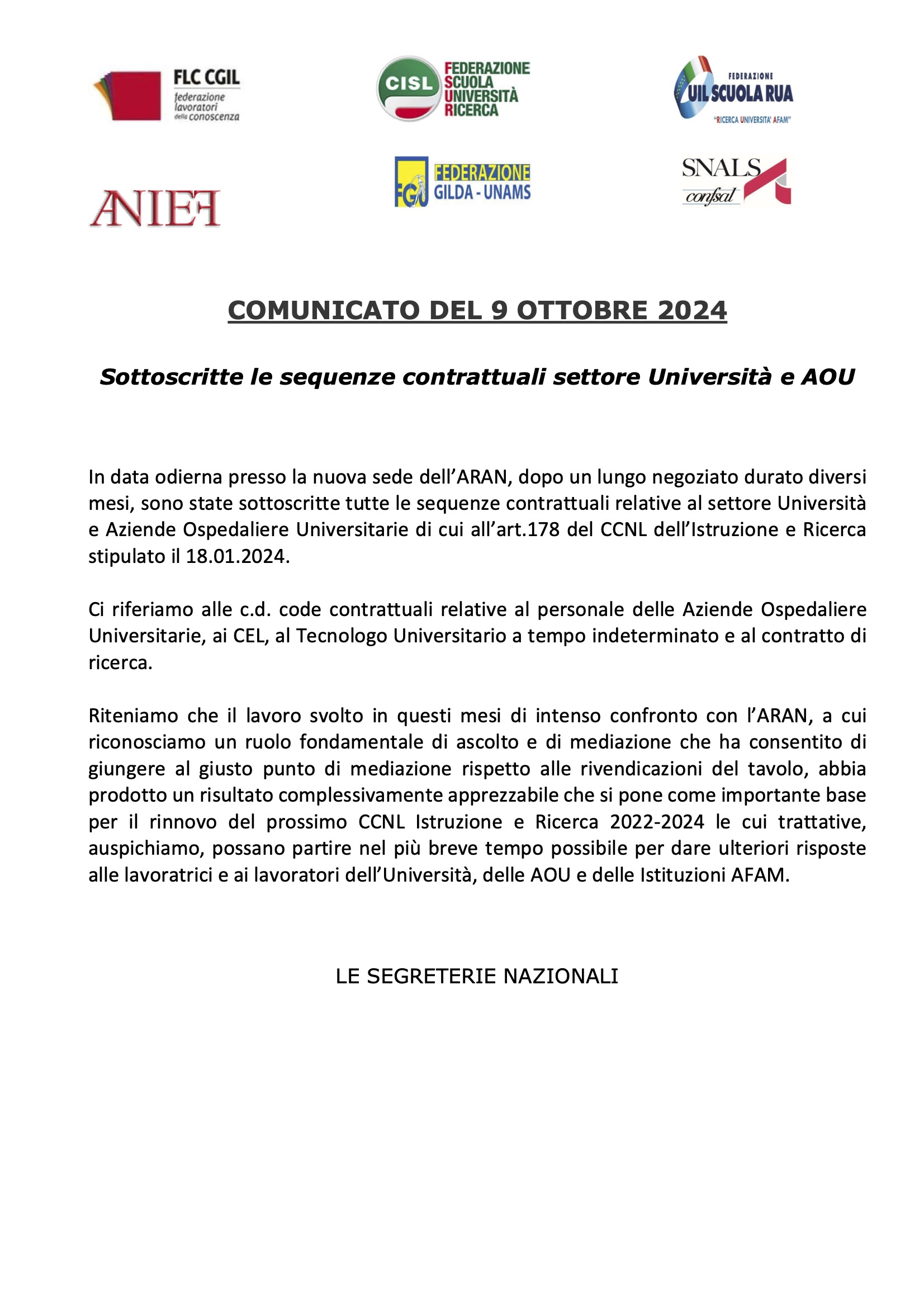 COMUNICATO UNITARIO del 9 OTTOBRE - FIRMA SEQUENZE CONTRATTUALI UNIVERSITA' E AOU