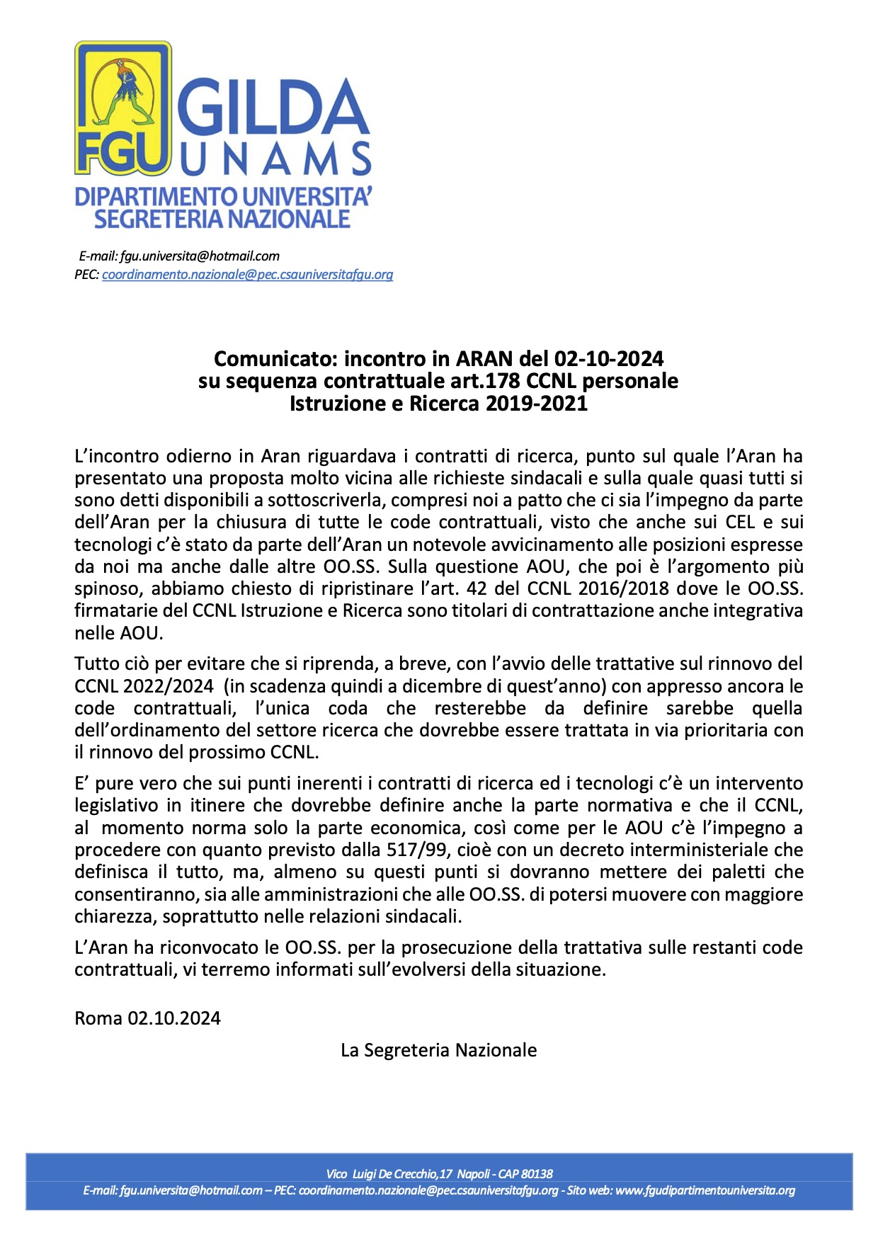 La segreteria nazionale Per la prosecuzione della trattativa per la sequenza contrattuale art. 178 CCNL del Personale Istruzione e Ricerca – triennio 2019/ 2021'' Convocate le OO.SS.c/o la sede dell'Aran ''