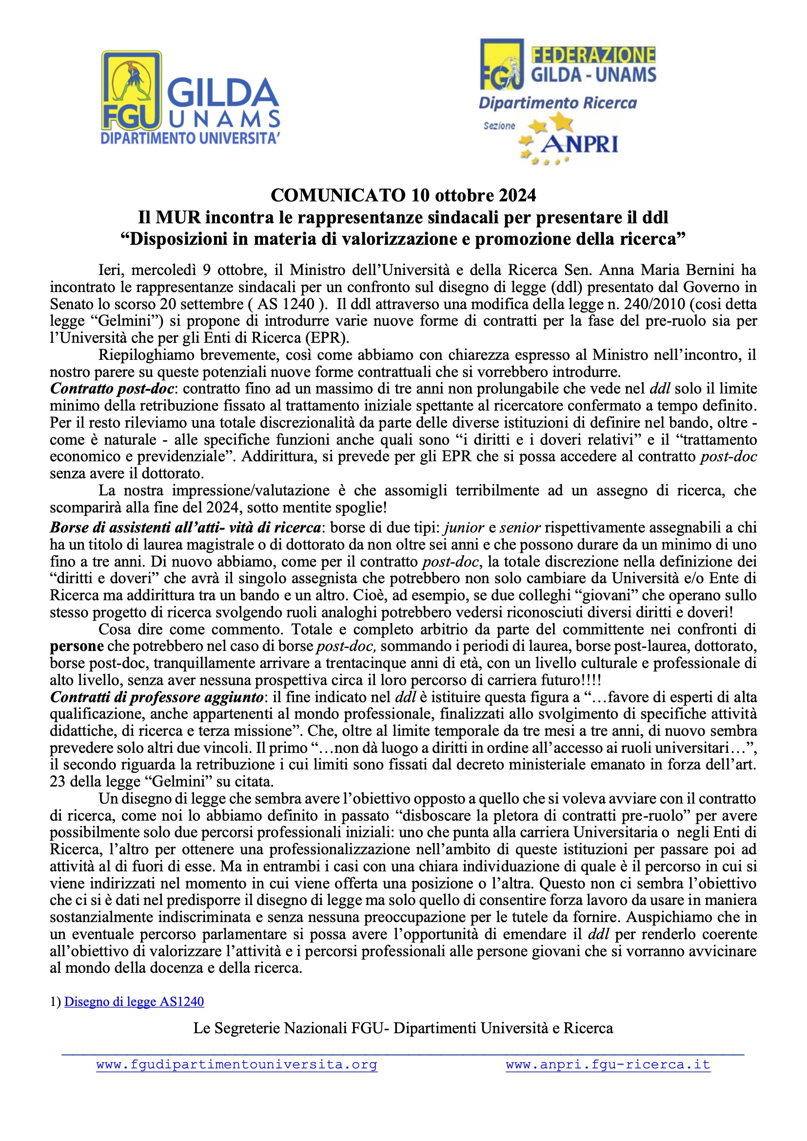 Alla riunione tenutasi al MUR il 9 us.il Ministro dell’Università e della Ricerca Sen. Anna Maria Bernini ha incontrato le rappresentanze sindacali per un confronto sul disegno di legge (ddl) presentato dal Governo in Senato lo scorso 20 settembre ( AS 1240 ). Il ddl attraverso una modifica della legge n. 240/2010 (cosi detta legge “Gelmini”) si propone di introdurre varie nuove forme di contratti per la fase del pre-ruolo sia per l’Università che per gli Enti di Ricerca (EPR).