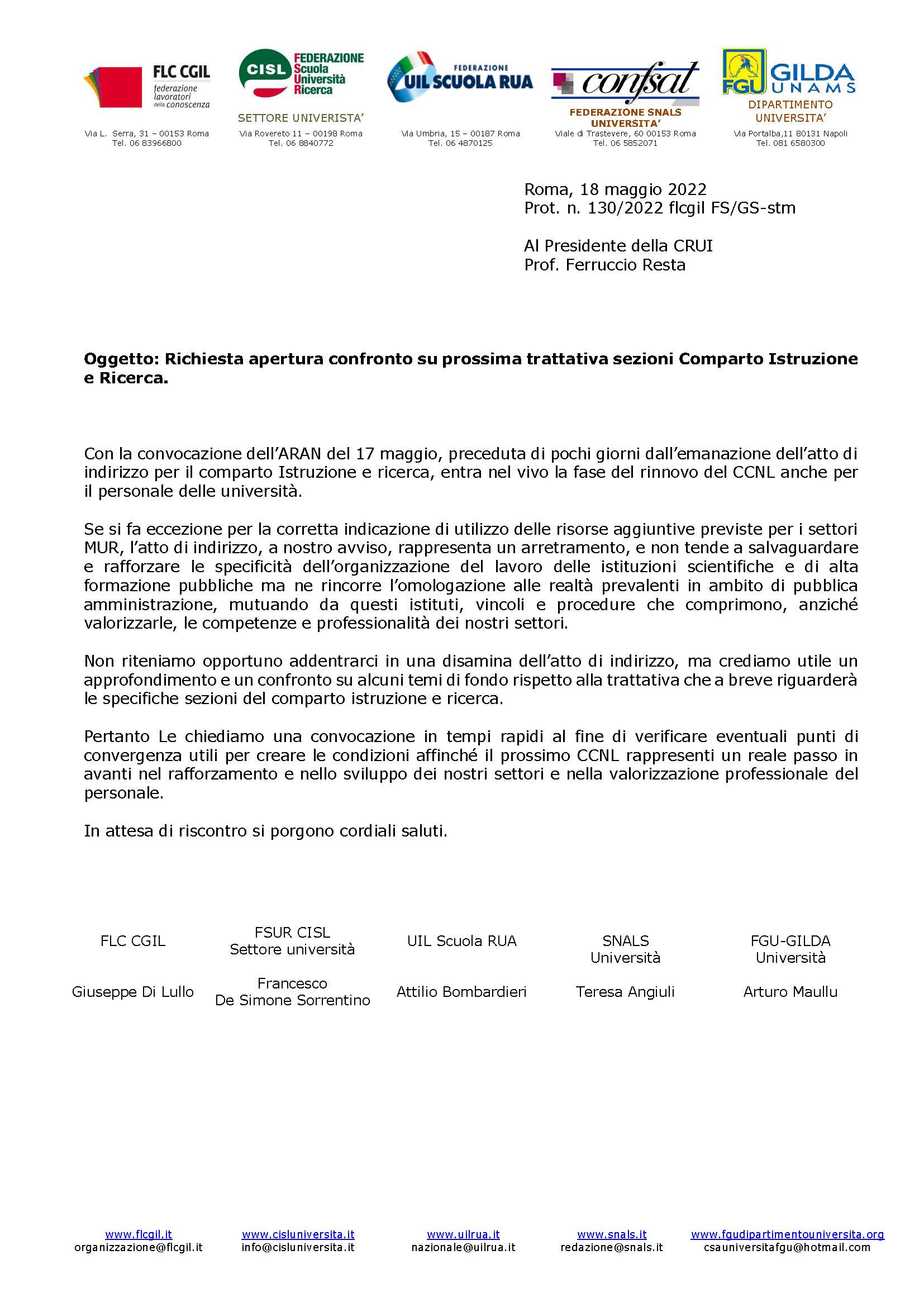 Richiesta unitaria delle OO.SS. del comparto Università inviata al presidente della CRUI, per una convocazione in tempi rapidi, al fine di verificare eventuali punti di convergenza utili per creare le condizioni affinché il prossimo CCNL rappresenti un reale passo in avanti nel rafforzamento e nello sviluppo dei nostri settori e nella valorizzazione professionale del personale.