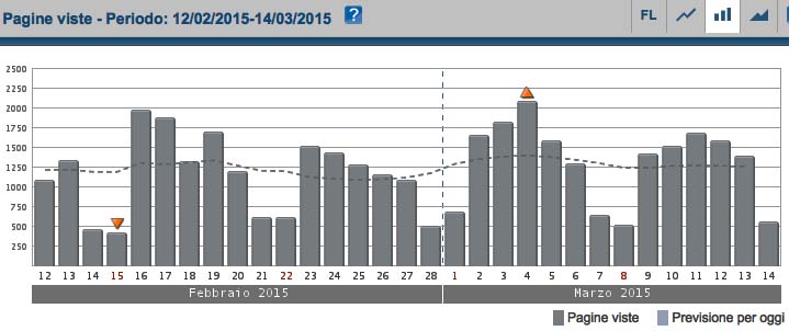 Giusto per rendere un’idea riportiamo qui di seguito un esempio grafico delle pagine visitate degli ultimi trenta giorni: periodo 12/02/2015 -14/03/ 2015 pagine viste 37.634 Media giornaliera 1.254